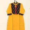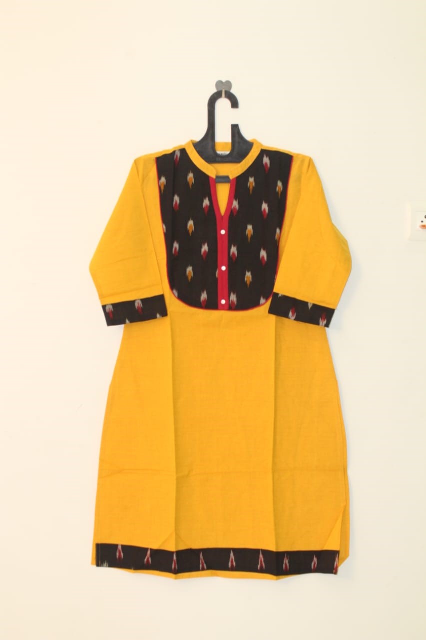 Regular knee length cotton top collar with oval shape ikat patch. Center red 1.5 inch patty with shell buttons, 3/4 sleeve, 3 inches placket, bottom 3 inches placket. Collar neck V shape with piping rope.